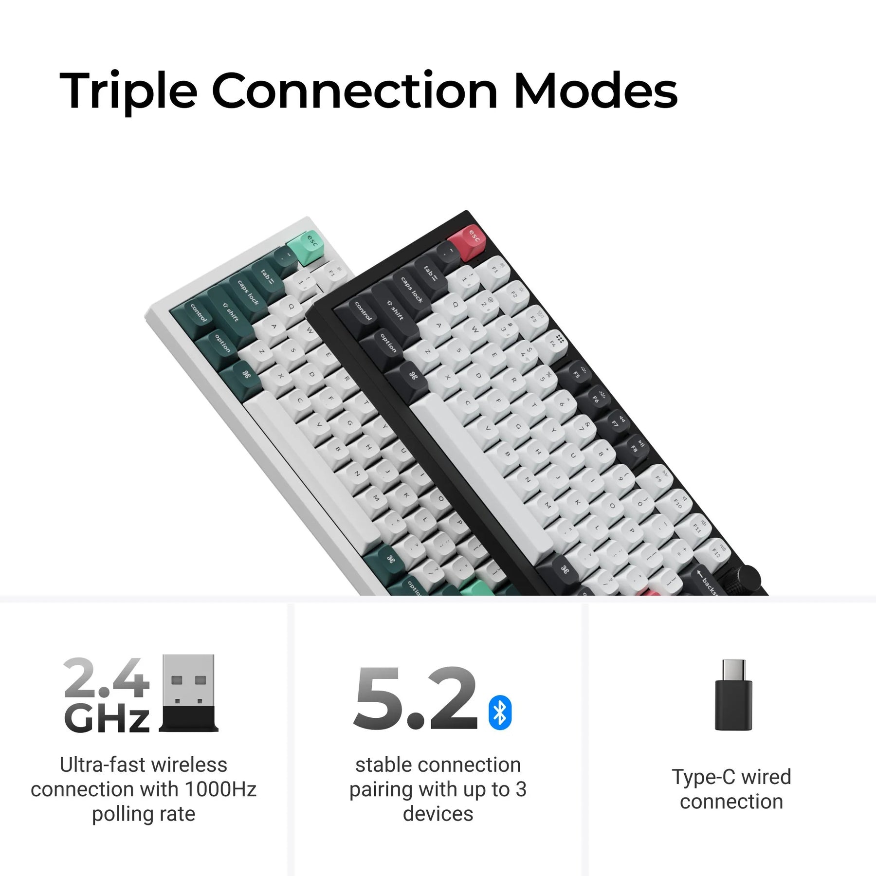 Desfrute do máximo desempenho em jogos com a conexão sem fio de 2.4 GHz do Q6 HE, que oferece uma taxa de polling ultrarrápida de 1000 Hz, garantindo resposta instantânea a cada comando. Para alternar facilmente entre dispositivos, o teclado também conta com Bluetooth 5.2, permitindo conexão simultânea com até três dispositivos — seja no computador, tablet ou smartphone.