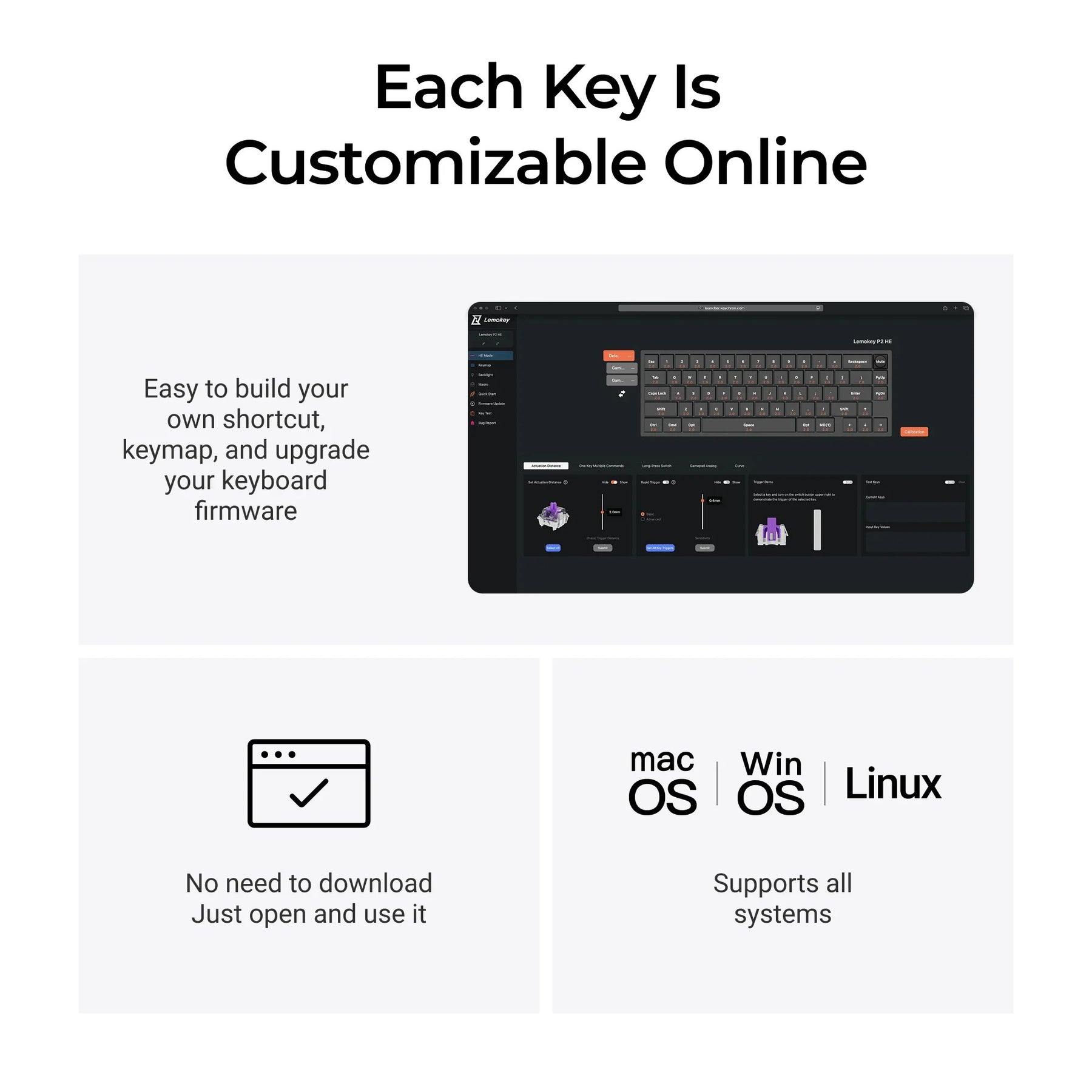 Por ser uma ferramenta baseada em navegador, o Lemokey Launcher funciona em todos os sistemas operacionais. Programe seu teclado no Windows, macOS, Linux e muito mais. Compatível com Chrome, Edge e Opera, oferecendo máxima flexibilidade onde você estiver.